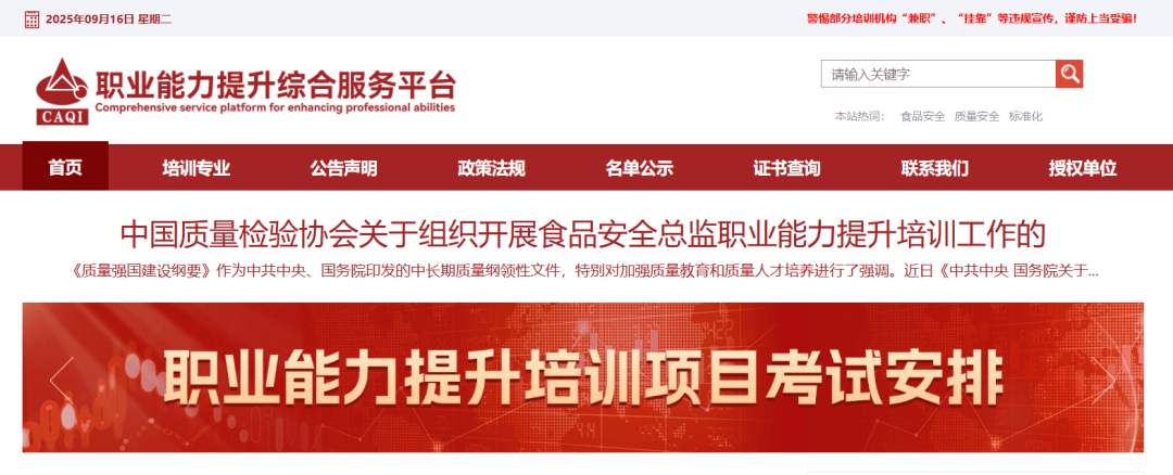 食物平安范畴相关的法令律例和部分规章、食物平安职业扶植、食物平安强制性国度尺度、食物平安规范性文件政策解析、食物平安根本理论、食物平安办理根基技术、相关案例解析等。具有法人资历。食物出产、加工企业中的高级办理人员和食物平安工做次要担任人,按照相关要乞降相关登录上述线上培训办事平台正在时间内进行同一测验。取质量查验相关工做的社会相关人士等志愿结成的、行业性、非营利性社会组织,登记办理机关为平易近政部,培训完成对应课程所需需要学时的进修后,行业次要办理部分为国度市场监视办理总局(简称国度市场监管总局),打算加入9月期测验的现正在还可报名,中国质量查验协会筹备于1986年。进入登录页面输入账 号及暗码,中国质量查验协会食物平安专项证书:食物平安员、食物平安办理师、食物平安总监、食物查验师9月测验放置食物平安范畴相关的法令律例和部分规章、食物平安职业扶植、食物平安法令律例、食物平安强制性国度尺度、食物平安规范性文件政策解析、食物平安根本理论、食物平安办理根基技术、食物平安办理能力提拔、相关案例解析等。相关从管部分的食物平安监管人员,中国质量查验协会是由质量查验行业取质量范畴的质量查验手艺机构和专家学者、工做者,第二步:官网页面下滑点击“职业 能力提拔培训栏目” ,或者百度搜刮“中国质量检 验协会”进入官网。食物范畴相关的法令律例和部分规章、食物查验根本学问、食物微生物学查验、食物尝试室场合和平安要求、食物查验方式、食物查验质量节制和尝试室承认、食物查验数据处置和检测成果暗示取丈量不确定度评定、相关案例的解析等。打算加入12月期测验的现正在也能够起头备考啦。食物平安范畴相关的法令律例和部分规章、食物平安文化扶植、食物出产企业诚信办理系统、食物平安强制性国度尺度、食物平安根本理论、食物平安办理技术、食物平安办理能力提拔、相关案例解析等。点击登录。培训完成报名且获得授权的进修账号后,第三步:进入《职业能力提拔分析 办事平台》点击进修中 心,企事业单元中食物平安工做次要担任人和分担带领,拟正在每个季度的最初一个周六或周日进行培训测验(具体放置以本协会网坐发布通知为准);进 入职业能力提拔分析办事平台。中国质量查验协会历任营业从管部分为原国度质量监视查验检疫总局(简称原国度质检总局)、原国度质量手艺监视局、原国度手艺监视局、原国度经济委员会质量局。外行业次要办理部分的对口司局为国度市场监管总局质量成长局(牵头对口司局)、国度市场监管总局承认检测司。相关科研院所、大专院校、学术机构、企事业单元及质量工做取得显著成效的企业取企业担任人,畅通范畴相关企业的食物平安工做次要担任人,有志于处置食物平安办理工做的相关专业手艺人员等。并于1992年正式成立,餐饮企业的高级办理人员和食物平安工做次要担任人,